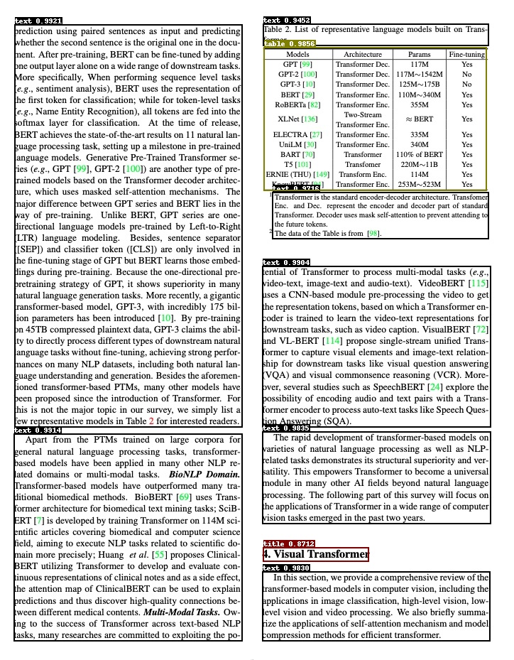 Layout analysis refers to the regional division of documents in the form of pictures and the positioning of key areas, such as text, title, table, picture, etc. The layout analysis algorithm is based on the lightweight model PP-picodet of PaddleDetection, including English layout analysis, Chinese layout analysis and table layout analysis models. English layout analysis models can detect document layout elements such as text, title, table, figure, list. Chinese layout analysis models can detect document layout elements such as text, figure, figure caption, table, table caption, header, footer, reference, and equation. Table layout analysis models can detect table regions.